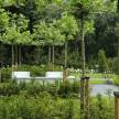 In deze tuin zijn de paden van op maat gemaakte betonplaten antracietkleurig. In de bakken van Corten staal staan rode Esdoorns. Terrassen van gebakken klinkers en grint.