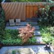In deze tuin zijn de paden van op maat gemaakte betonplaten antracietkleurig. In de bakken van Corten staal staan rode Esdoorns. Terrassen van gebakken klinkers en grint.