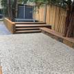Tuin 40 m2 op dak parkeergarage. Terrassen en hoogteverschillen in hout, Bilinga. Plantvakken, paden en bankje in Corten staal.